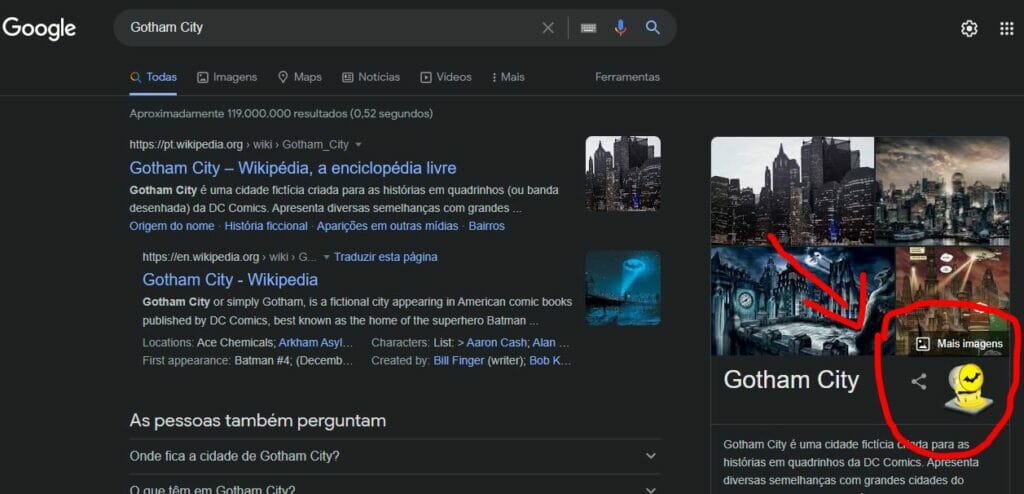 Diferente das outras vezes que é necessário clicar no “Estou com Sorte”, desta vez é só entrar na página principal do Google, clicando aqui. Digite Bat-Signal, Bruce Wayne ou Gotham City. Dê um Enter e você será direcionado para a resposta da busca.