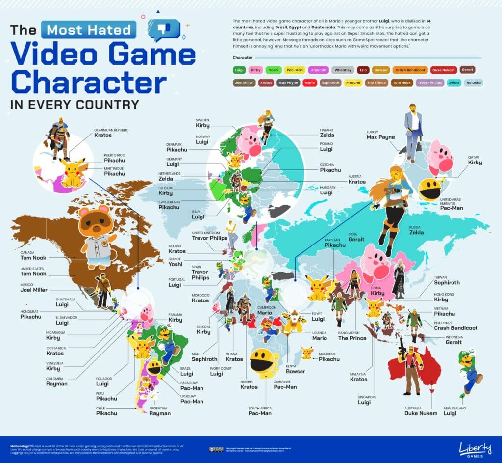 Um dos aspectos peculiares do estudo é que Sonic the Hedgehog está entre as franquias mais populares do mundo, mas o herói titular nem sequer é mencionado em nenhuma das listas de personagens. Embora Luigi, da Nintendo, seja o personagem mais odiado de todo o mundo, ele continua sendo o mais amado em países como Chile, Marrocos, Polônia e Quênia, enquanto Mario é odiado apenas em Camarões.