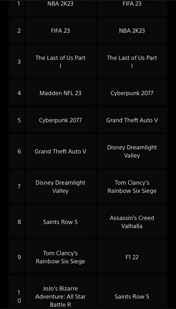 O FIFA 23 foi o jogo mais vendido na Europa para PS5 e PS4, enquanto na América do Norte, o game da EA Sports ficou com o segundo lugar na lista de ambos os consoles. Aconteceu algo parecido na América do Norte, mas com NBA 2K23 liderando e com o 2º lugar na Europa.