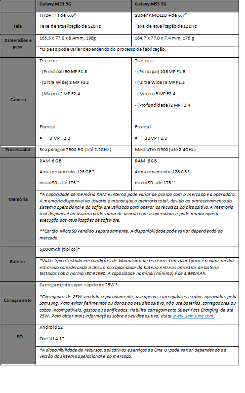 A Samsung apresenta, nesta terça-feira (17), os dois novos integrantes da família M no Brasil: o Galaxy M23 5G* e o Galaxy M53 5G*. Os novos smartphones serão vendidos exclusivamente online e, além de compatíveis com a tecnologia 5G, se destacam por seus recursos e benefícios, como performance potente, câmeras de versáteis, tela grande com 120 Hz de taxa1 de atualização e bateria que não te deixa na mão.