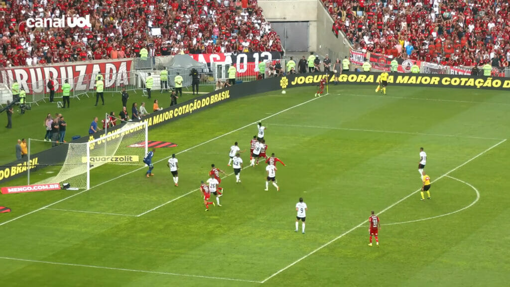 Publicidade de aposta esportiva domina painéis LED instantes antes do 4º gol do Flamengo, que goleou Athletico-PR por 5 a 0 em partida válida pelo Campeonato Brasileiro de 2022. (Imagem: Reprodução Youtube UOL)