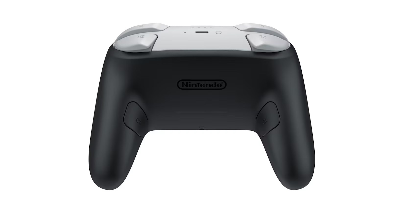 O controlador Switch 2 Pro é quase idêntico ao controlador Switch Pro original, embora o novo tenha um botão C e um par de botões programáveis (GL e GR) incorporados na parte traseira das garras manuais do Switch 2 Pro Controller. O Switch 2 Pro Controller também 3,5 mm por porta de fone de ouvido abaixo do botão C, facilitando a conexão de um par de fones de ouvido com fio.