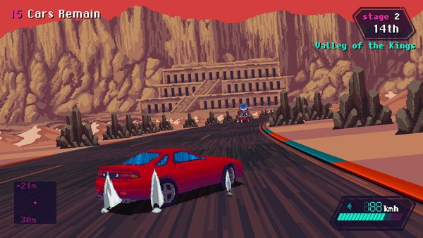A combinação dos gráficos coloridos de pixel art com uma trilha sonora inspirada em synth pop e jazz fusion de Stefan Moser, também conhecido como Effoharkay, dá o tom para uma viagem por uma variedade de locais exóticos do mundo todo, incluindo cidades, desertos, florestas, montanhas e praias. As mecânicas de derrapagem, manipulação do tempo e slipstream, adicionam profundidade à jogabilidade, e o resultado é uma experiência estratégica, desafiadora e emocionante.
