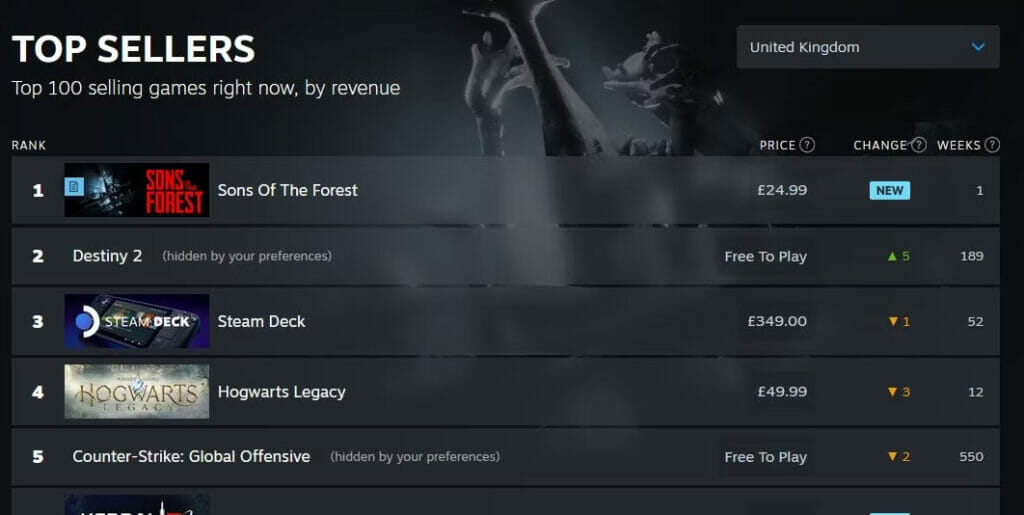 Com a sinistra floresta titular repleta de criaturas e tribos canibais, sem mencionar seus aspectos de criação e cooperação, o título de terror de sobrevivência parece estar indo muito melhor do que muitas pessoas esperavam, o que pode ser evidenciado por sua posição nas paradas. Sons of the Forest não é apenas o jogo mais vendido no Steam no momento, mesmo superando o dispositivo Steam Deck da Valve, mas também é o número seis na lista dos jogos mais jogados na plataforma.