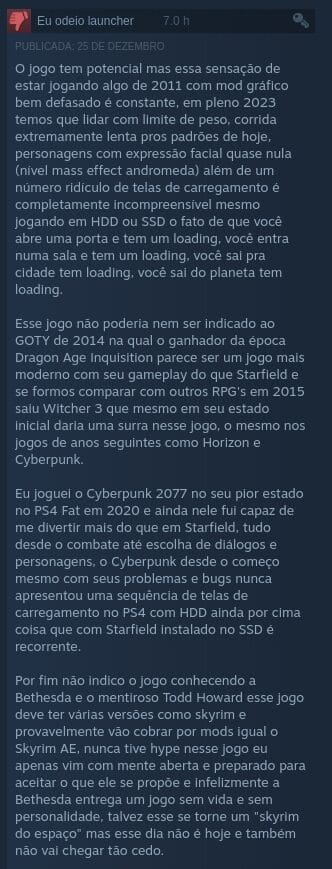 Embora a Bethesda deva ser elogiada por tentar fazer algo diferente, parece que a maioria dos jogadores está insatisfeita com a direção tomada. O foco singular de Starfield na geração processual provavelmente o privou da “mágica” que atraiu os fãs aos jogos da Bethesda em primeiro lugar, e alguns jogadores afirmaram que parecia mais um parque temático de mundos vazios e cidades estáticas conectadas por meio de telas de carregamento do que a experiência sandbox imersiva que os títulos mais antigos da Bethesda canalizavam com tanta facilidade.