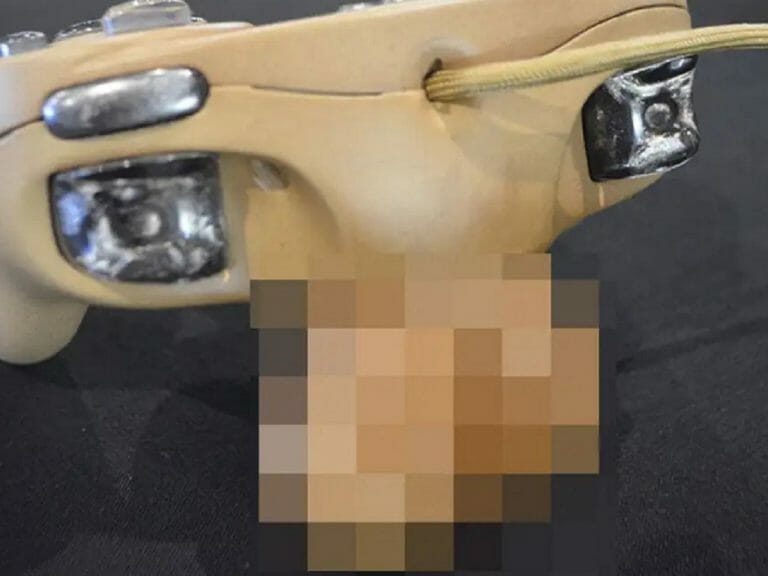 Ao reparar rapidamente no controlador, parece apenas mais um só que bege, mas se olharmos mais detalhadamente, podemos ver ‘pele humana esticada’, ou seja, um grande conjunto de bolas e veias. Bom, não bastasse a notícia toda ser meio absurda, você já deve estar se perguntando onde está o ‘restante’ do órgão, e ele só poderia estar em um dos dois lugares. Sinto em dizer que a parte que falta pode ser encontrada no plugue do controlador…