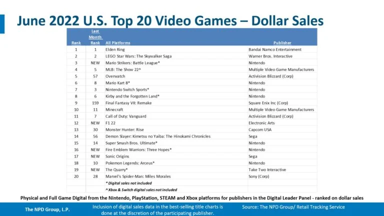 Elden Ring foi lançado em 25 de fevereiro, vendendo 13,4 milhões de unidades em todo o mundo em 31 de março, de acordo com a editora Bandai Namco. Lego Star Wars: The Skywalker Saga foi mais uma vez o segundo título mais vendido do mês nos EUA, em junho.