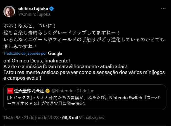 Anteriormente, em 2022, Fujioka comentou que adoraria fazer uma sequência de Super Mario RPG, esperando que também fosse seu jogo “final” antes de se aposentar. Fujioka estava trabalhando em outros RPGs do Mario na AlphaDream, incluindo o último lançado pelo desenvolvedor antes de seu colapso, Mario e Luigi: Bowser’s Inside Story + Bowser Jr.’s Journey. Independentemente disso, o ex-diretor está muito animado para ver o que o remake trará, comentando até mesmo que se pergunta como os minijogos e o design de campo do jogo serão tratados.