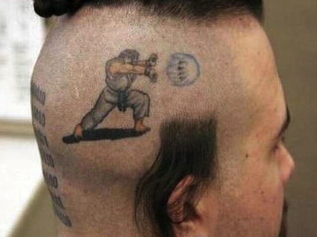 Que Street Fighter não sai da cabeça de muitas pessoas desde o século passado, não é nenhuma novidade, mas tatuar realmente na cabeça, é algo a se pensar. Ainda mais desta forma. A tatuagem do Ryu soltando seu hadouken até ficou legal, mas com uma quantidade de binários atrás da cabeça deste fã e este corte de cabelo, ok, com certeza ele é um candidato a pior ideia de tatuagem de todos os tempos.