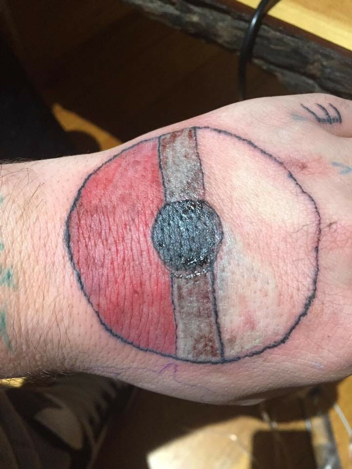 Aqui está nosso primeiro exemplo do que JAMAIS deve ser feito. Não dá para saber se foi a própria pessoa que desenhou esta… ou este, não se sabe dizer direito o que, ou se o tatuador estava com algum problema. Além disso, na parte debaixo da tatuagem da pokébola, ainda tem um rabisco feito a caneta (?) de algum tipo de tubarão… Bem, independente de qualquer coisa, este é um exemplo a não ser seguido.