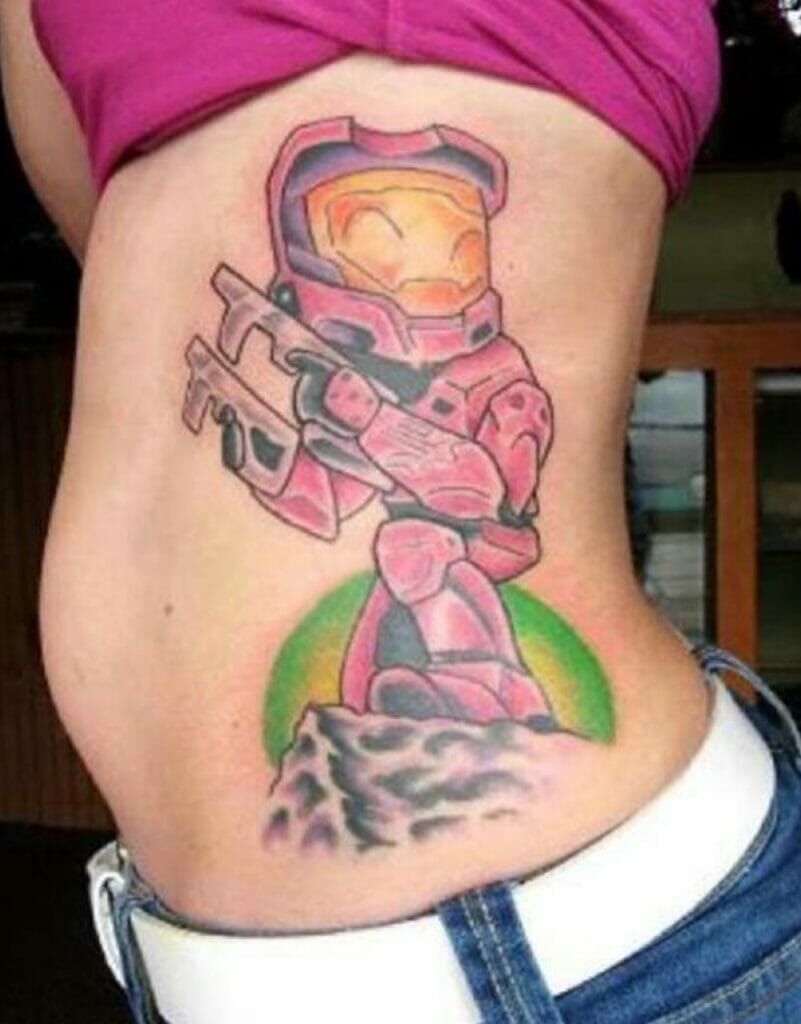 Mais um exemplo que ninguém sabe o que deveria ser esta tatuagem. É de Halo sorrindo? algum anime? E estas armas? Atrás é um sol de algum planeta distante? Alguém poderia dizer o que é esta tatuagem bugada?
