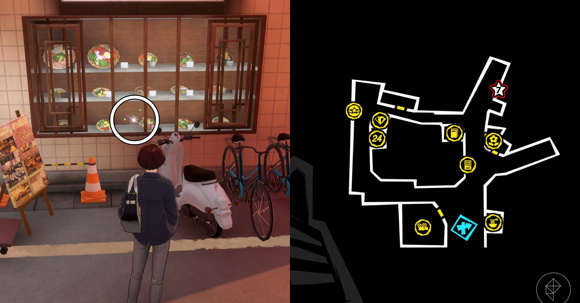 O sétimo tesouro de Tabby Orange está localizado no lado norte do mapa na vitrine de um restaurante. Interaja com a janela para entrar no restaurante e pegar o tesouro.