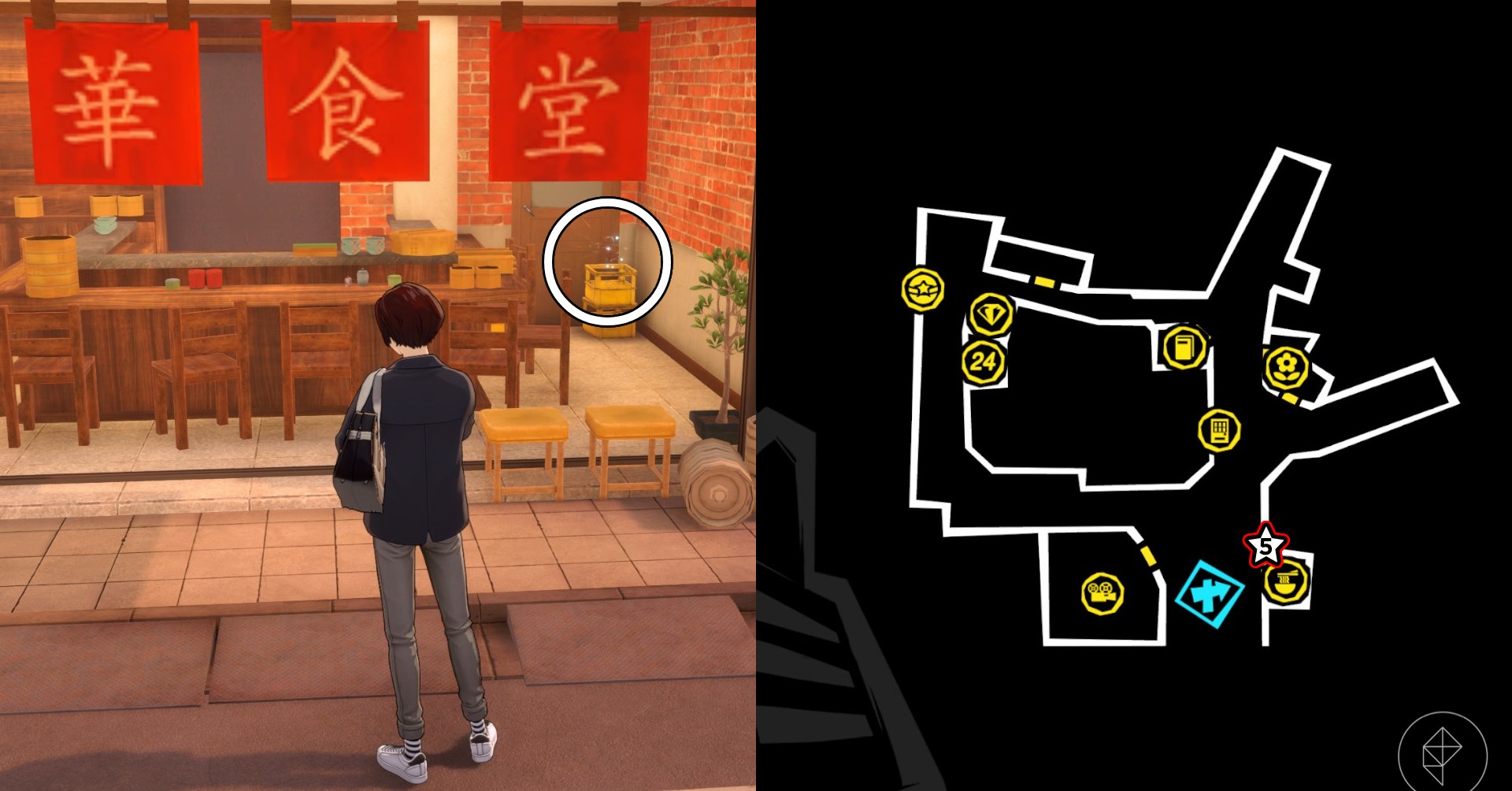 O quinto tesouro de Tabby Orange está dentro de uma caixa amarela em Izakaya, que fica ao norte da loja de ramen, na esquina sudeste. Interaja com o izakaya para receber o tesouro.