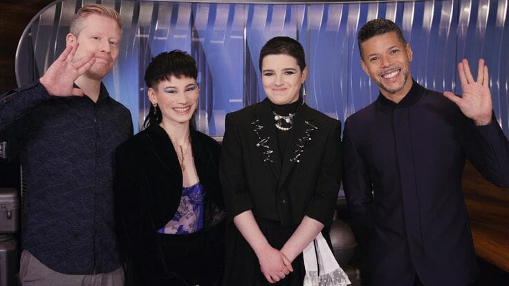 Na foto: Paul Stamets (Anthony Rapp), Adira Tal (Blu del Barrio), Grey Tal (Ian Alexander) e Hugh Culber (Wilson Cruz)