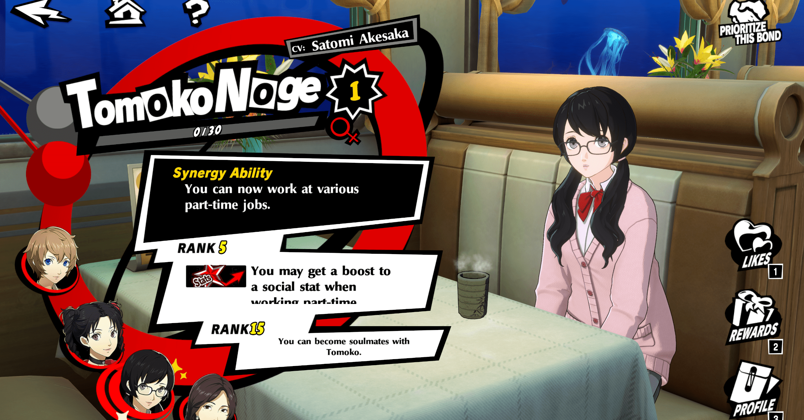 O Bond Synergy de Tomoko é desbloqueado ao concluir a missão paralela “Dreamer em período parcial”. Aumentar o vínculo de Tomoko fornece atualizações de trabalho de meio período, como um impulso às suas estatísticas sociais.