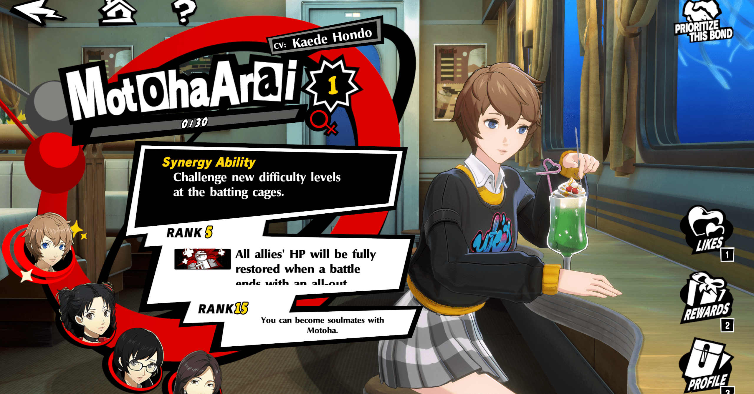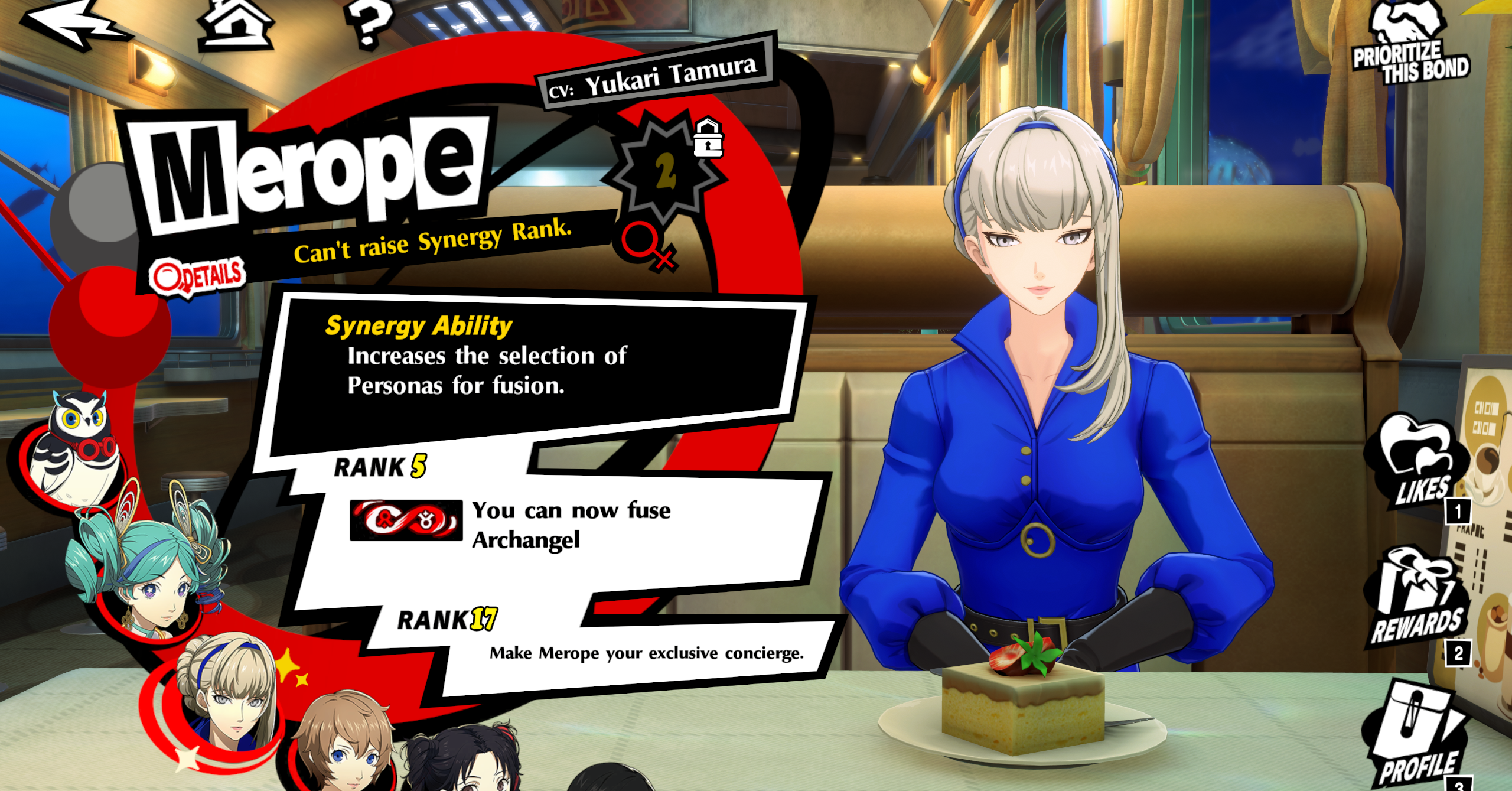 O vínculo de sinergia de Merope também é desbloqueado através da progressão da história. Depois de completar a missão “Traces of Dreams”, você pode passar um tempo com ela para aumentar sua classificação. Aumentar seu vínculo permite que novas personas sejam fundidas por admiração.