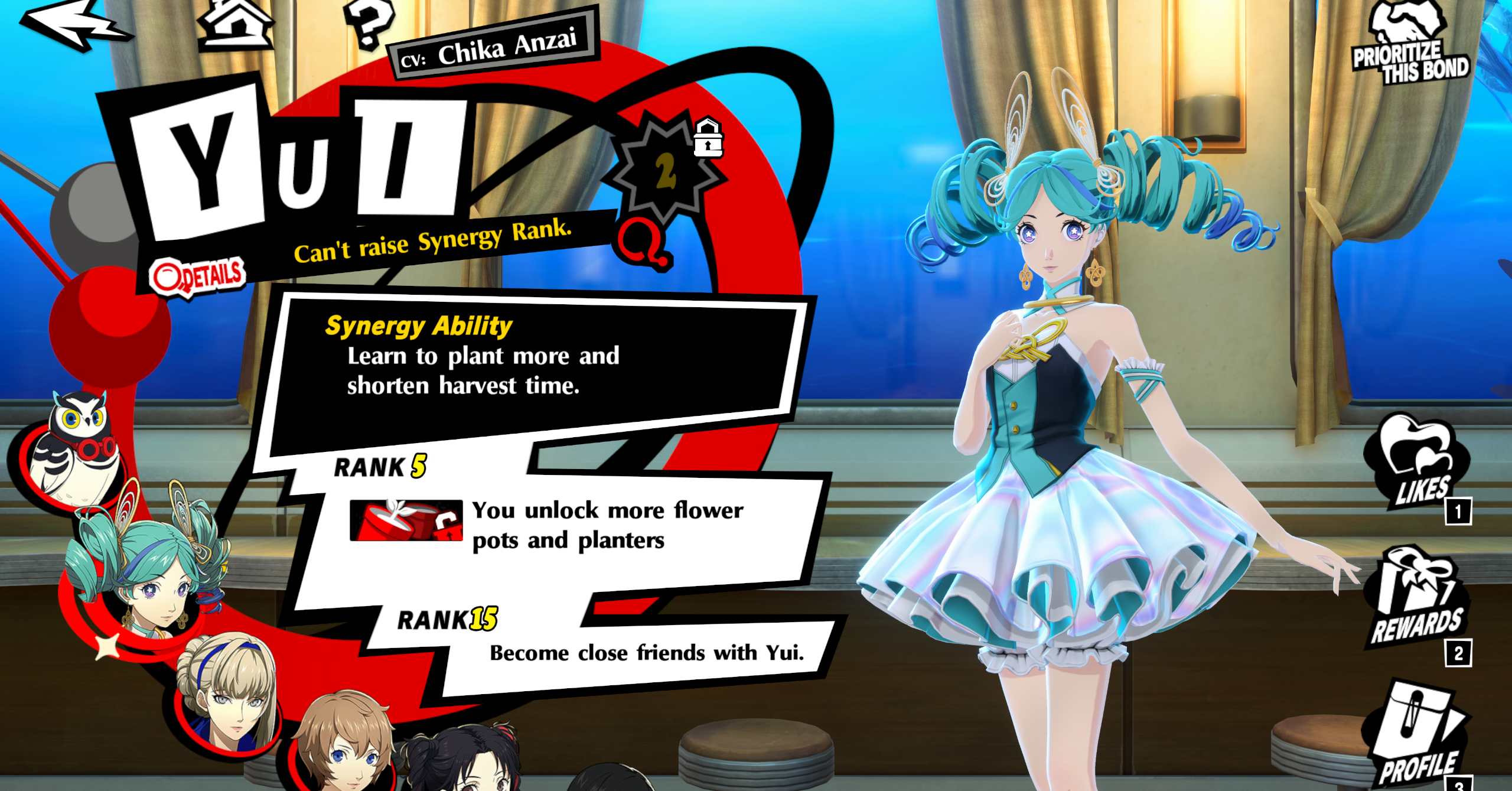 O vínculo de sinergia de Yui é desbloqueado ao concluir a missão lateral do “encontro virtual”. Aumentar o título de Yui fornece atualizações de crescimento das plantas, permitindo que você plante mais flores.