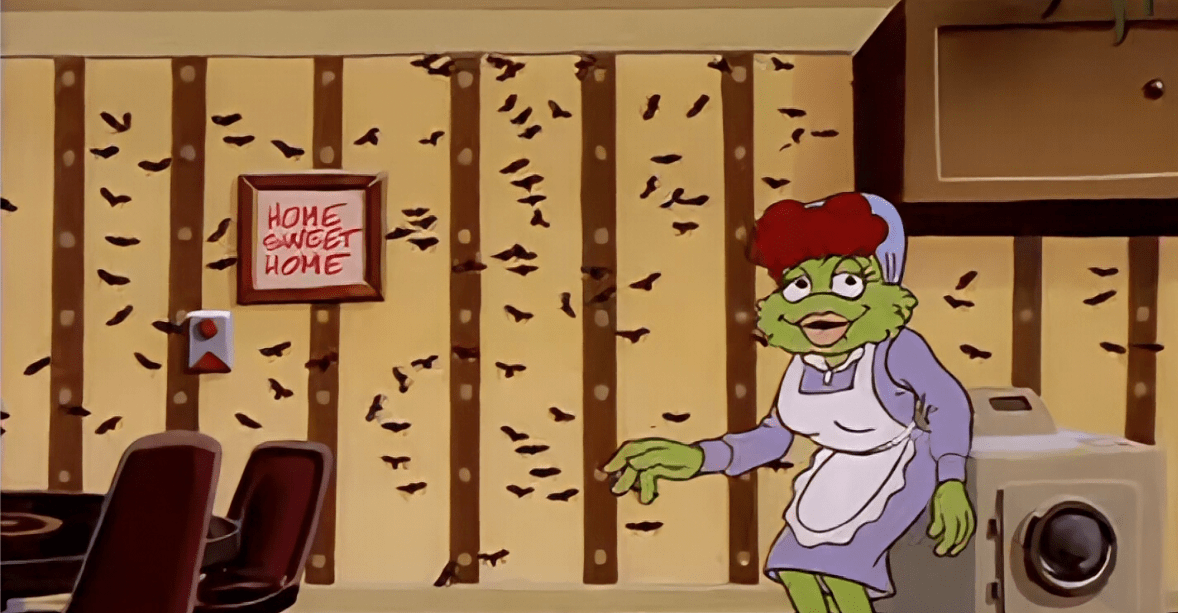 Mas enquanto os personagens e tramas são surpreendentemente ricos, a melhor coisa sobre Bucky O’Hare é Toad TV. Os lacaios e o FRAX do marechal aéreo estão constantemente colados na tela, e a programação de Komplex também é usada para torturar cativos de mamíferos, que compreensivelmente não apreciam que a TV Toad consiste principalmente em comerciais para produtos nojentos. Existem cremes que aprimoram o crescimento da verruga (um símbolo da masculinidade do sapo), um alimento semelhante ao spam feito de moscas esmagadas e papel de parede que funciona como papel de mosca, para que o proprietário sempre tenha um lanche na mão. As mulheres de sapo são sempre apresentadas como modelos de donas de casa dos anos 50 ou modelos de biquíni que Frik e Frak babam, um contraste claro com as visões progressivas de gênero de Bucky e destinadas a mostrar como os sapos são grosseiros e desprezíveis.