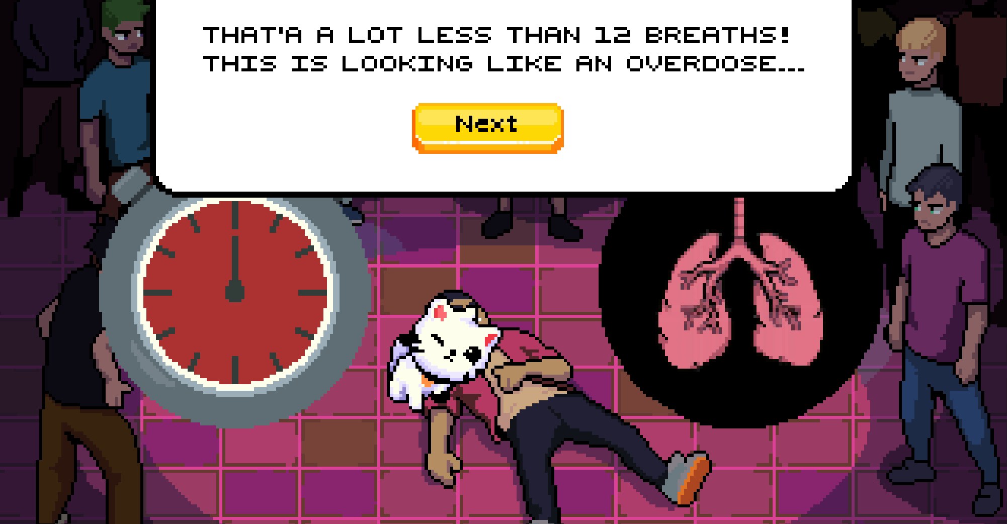 O objetivo de longo prazo é ambos. Cada experiência de overdose tem dois arcos: o personagem passando pelos sintomas e depois no narcat tentando salvá -los. O objetivo é ensinar aos jogadores o perigo e as medidas de intervenção.