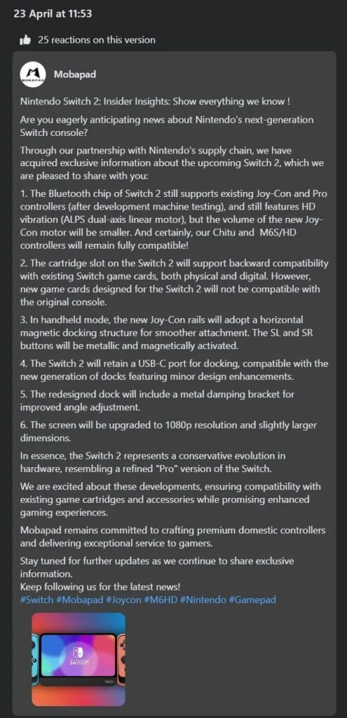 Embora a publicação original tenha sido editada, o site Wccftech conseguiu capturar a imagem do texto original, revelando que o console terá uma resolução de 1080p em uma tela “ligeiramente maior”, com Joy-Cons com fixação magnética e compatibilidade com todos os controles lançados pela empresa até agora.