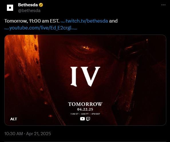 A Bethesda levou suas contas em sites de mídia social como o Instagram e o Twitter para compartilhar uma imagem com a fonte do Elder Scrolls IV: Oblivion com apenas “IV” exibido e uma máscara blindada em segundo plano. O tweet diz: “Amanhã, 11:00 EST” e lista os URLs para os canais Bethesda Twitch e YouTube. Quando você visita o canal do YouTube, você é recebido pela mesma arte, com uma transmissão ao vivo que tem o título: “Tudo será revelado ….”