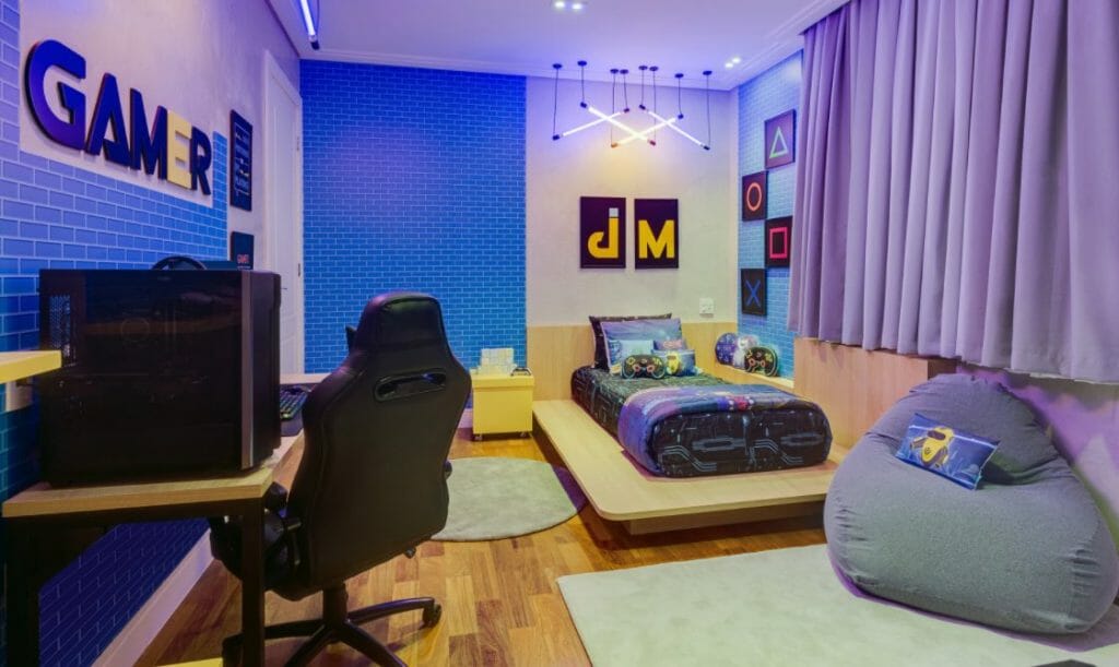 Para os itens decorativos, a missão ficou a cargo da empresa Grão de Gente, que se encarregou de preencher o espaço com itens de de cama, almofadas, puffs, quadros além de outras peças. Através do vídeo de divulgação da marca, também é possível notar que o quarto possui o que há de mais moderno em jogos eletrônicos.