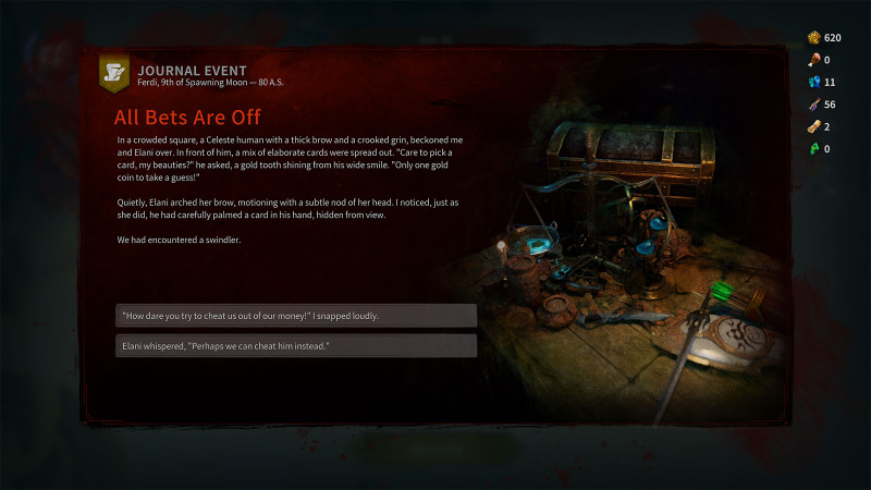 Elani e Yara fogem de seu ataque em casa através das catacumbas para cada corrida, o que as coloca em uma caravana em movimento. A caravana se move ao longo das estradas e nos garfos, os jogadores devem tomar decisões sobre qual caminho seguir. Às vezes, pode ser uma questão de conhecer um comerciante ou outros momentos da história, mas muitas vezes isso leva ao combate.